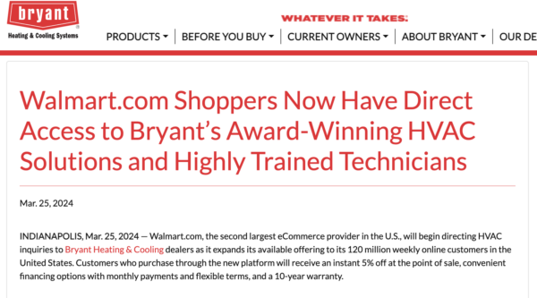 At the end of March Walmart.com announced that they will begin directing HVAC inquiries to Bryant Heating & Cooling dealers as it expands its available offering to its customer bases. Walmart states they are the second largest ecommerce provider in the US with 120 million weekly online customers in the United States. The US Census Bureau currently estimates their are 336 Million US residents just to give you an idea of the reach of walmart.com.